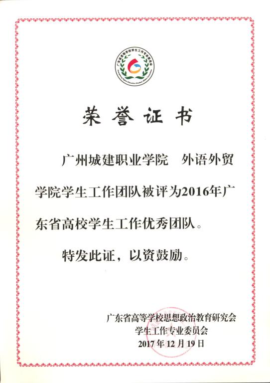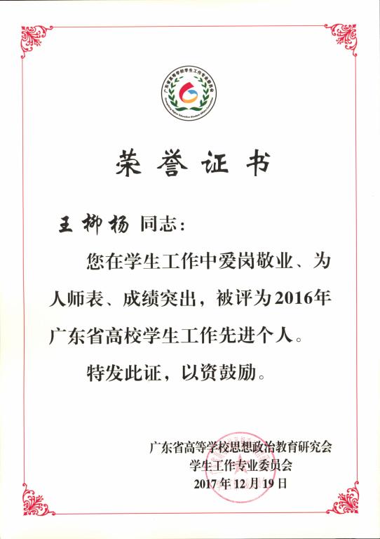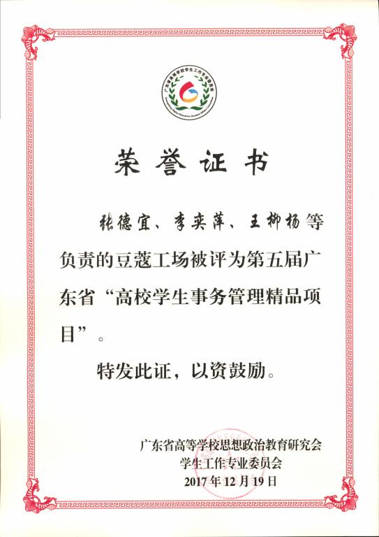 会议对2016年度广东省高校学生工作先进个人、优秀团队、精品项目等进行表彰。我校“豆蔻工场”被评为第五届广东省“高校学生事务管理精品项目”,外语外贸学院学生工作团队被评为2016年广东省高校学生工作优秀团队,学生处王柳杨老师被评为2016年广东省高校学生工作先进个人。